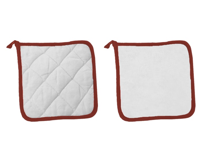Sujetador de utensilios calientes, de tela tipo ?manta? con detalles al filo y presilla para colgar.