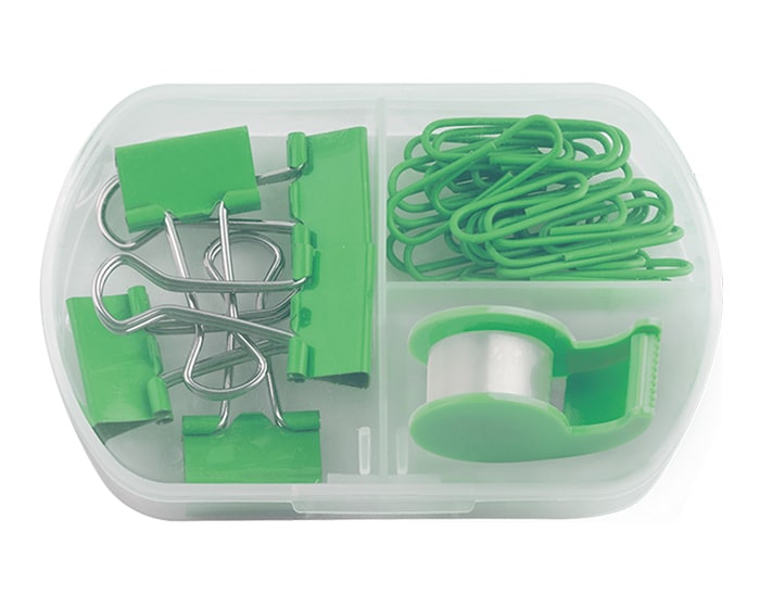 Set de papelería que incluye mini despachador de cinta adhesiva, 5 clips sujeta documentos y 20 clips para papel. Presentación: estuche de plástico transparente.