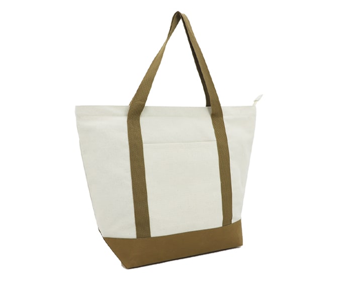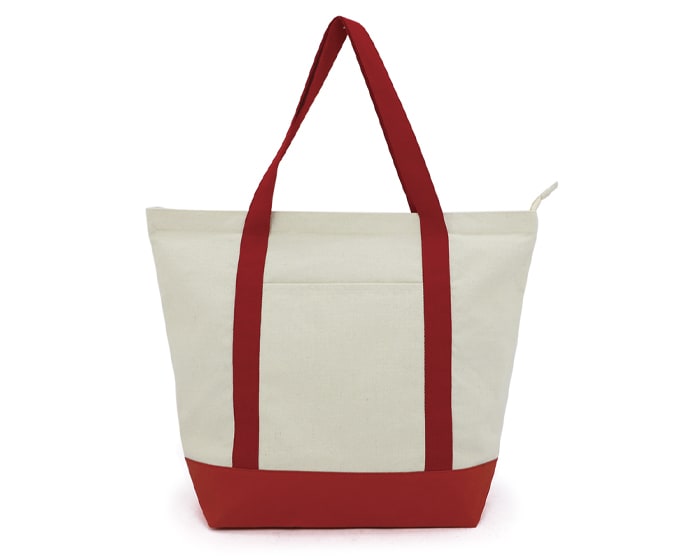 Bolsa cosida de poli algodón con base de kraft, cuenta con un compartimento principal con cierre, bolsillo interno con cierre y bolsillo frontal externo. Incluye base y 2 asas de algodón del mismo color.