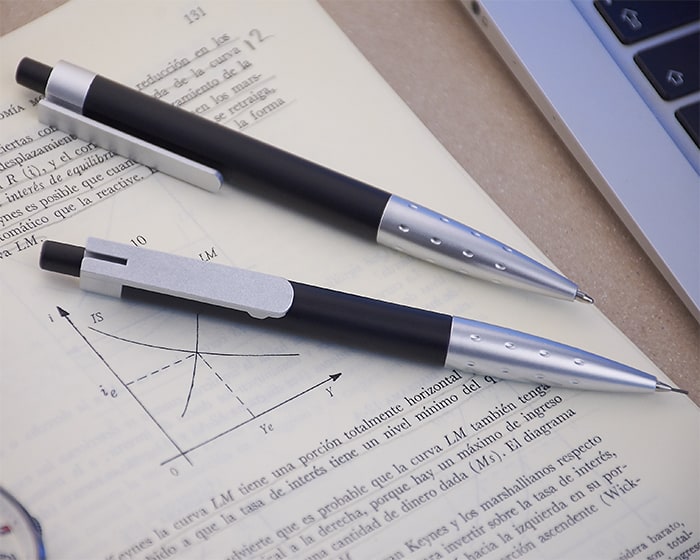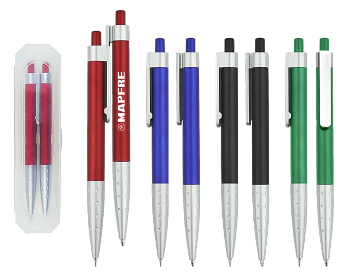 Juego de bolígrafo y lapicero de plástico con clip que se ensambla uno al otro para quedar perfectamente unidos. El clip y la parte inferior vienen en color plata, esta última con diseño de pequeñas hendiduras. Incluyen estuche traslúcido de plástico. Mecanismo de click.