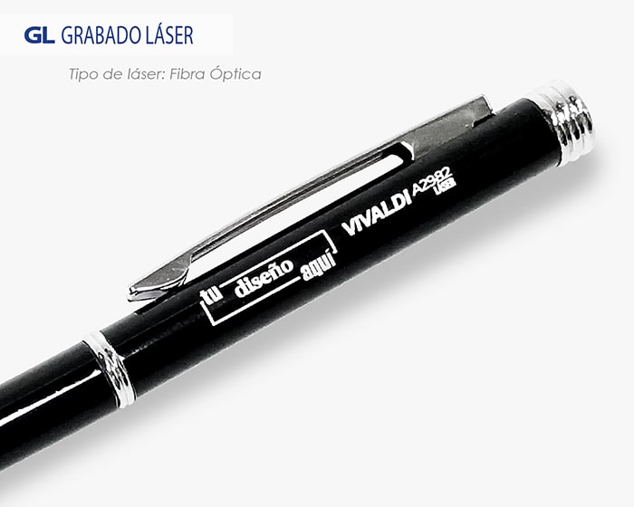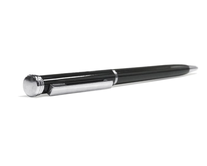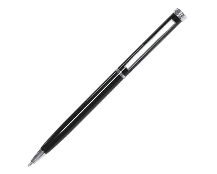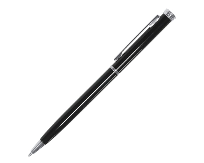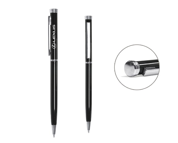 Bolígrafo metálico de suave escritura y cuerpo delgado en color negro satinado, cuenta con clip, punta, anillos centrales y detalle superior cromados. Mecanismo retráctil.