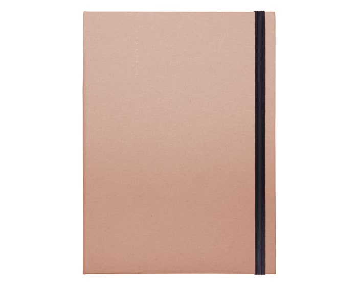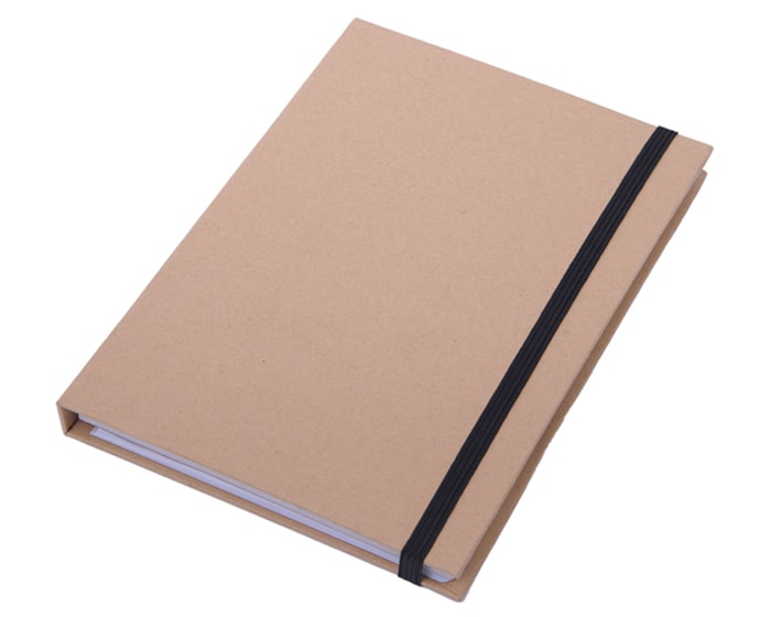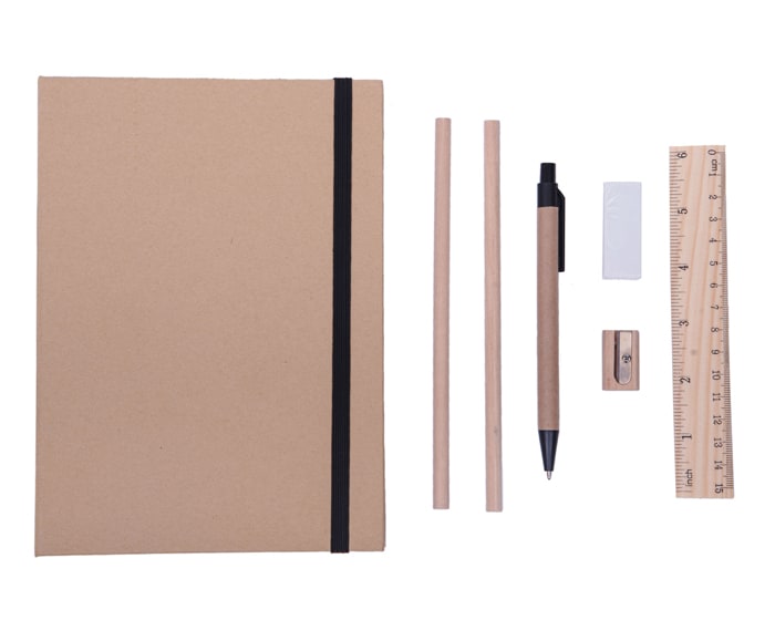Estuche ecológico de cartón con resorte para cerrarse, cuenta con: Block de 40 hojas rayadas, regla de 15 cm, bolígrafo de cartón, goma blanca, sacapuntas y 2 lápices.