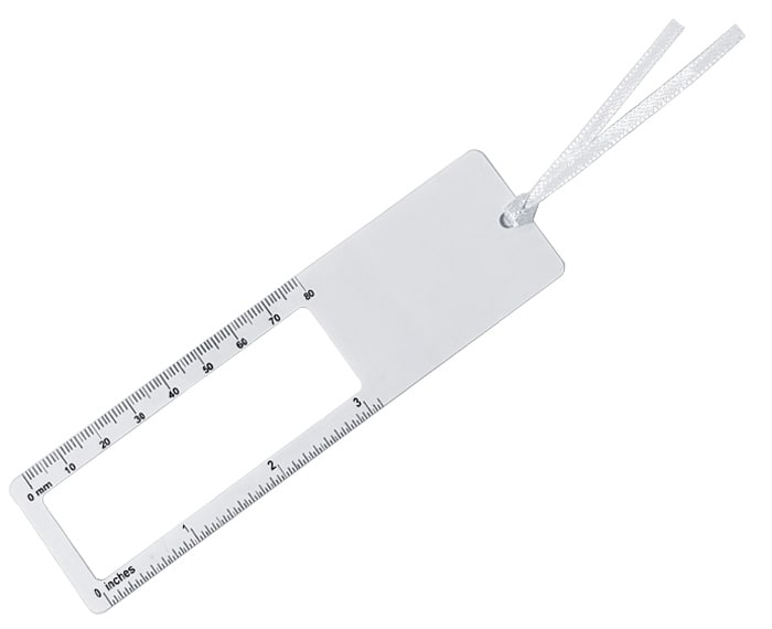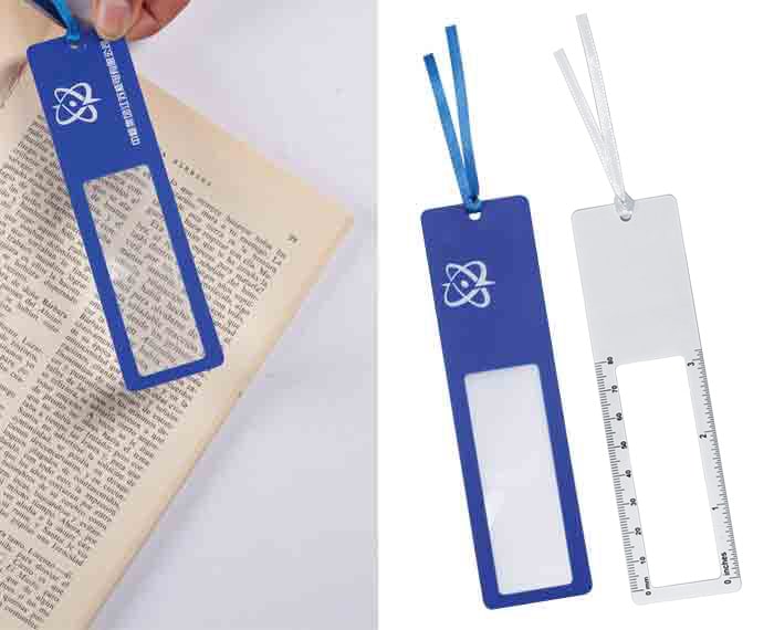 Separador de plástico con ventana de lupa, con orificio para listón. Artículo Promocional