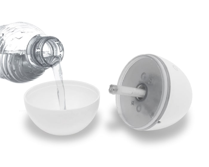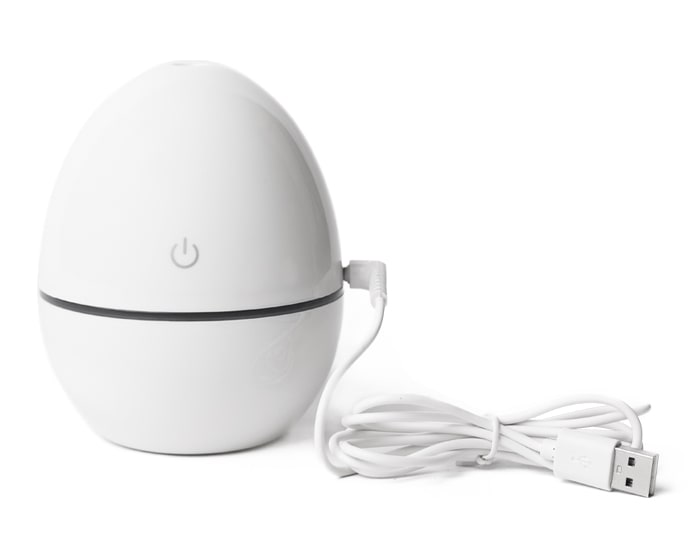 Humificador ultrasónico (sin sonido) en forma de huevo giratorio a 360° con luz LED en color azul y botón touch para encender y apagar. Cap. 200 ml. Incluye cable de carga USB. Presentación: Caja de regalo a color.